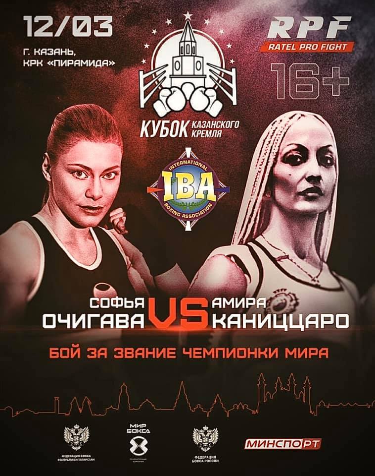 IBA in RUSSIA ?? RATEL PRO FIGHT March 12 . 2020 Kazan Women\’s IBA Lighweight World Championship ( 135 lbs ) between Sofia Ochigava. Russia ?? and Angela Cannizzaro . Italy ?? Supervisor : Mrs Iana Bilokonenko IBA International Junior Middleweight (154 LBS / ) Championship Vitaly Petryakov, Russia ?? Vs Justice Addy , ghana ?? Supervisor : Mrs Iana Bilokonenko