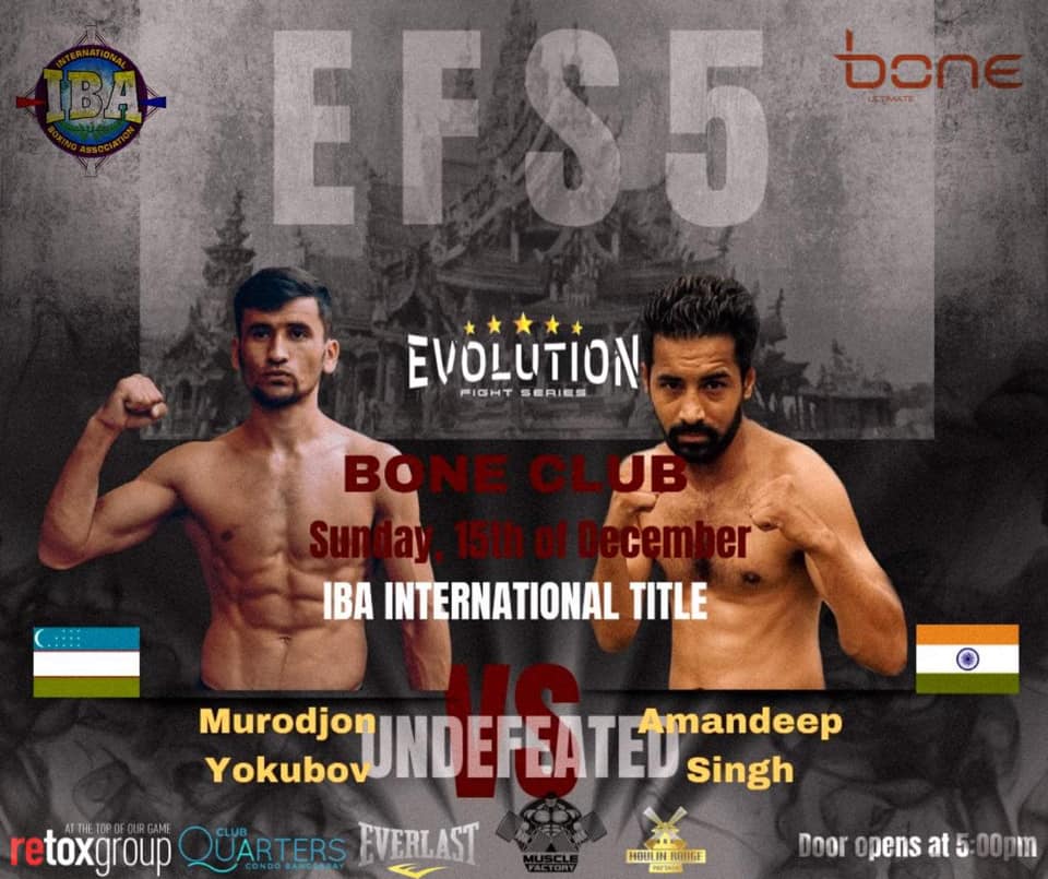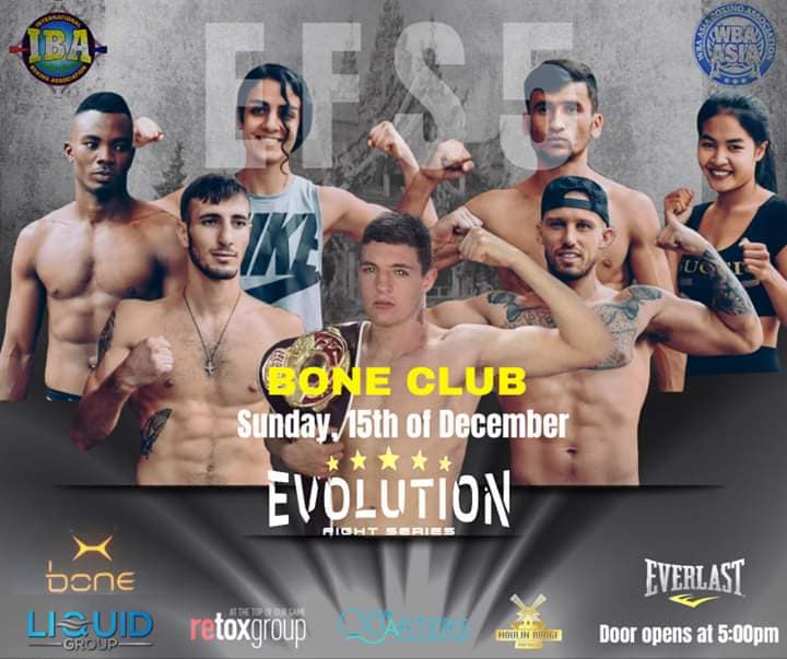 Evolution Fight Series 5 Sunday 15, December 2019 Bone Night Club, Pattaya, Thailand Promoteur : Mr Alexander Shah Main Event : IBA INTERNATIONAL LIGHTWEIGHT Championship Murodjon Yokubov ( uzbekistan ??) vs Amandeep Singh ( India ??) IBA INTERNATIONAL ASIA super LIGHTWEIGHT Championship Musheg Adoian ( russia ??) vs Roy Mukhlis ( Indonesia ??)