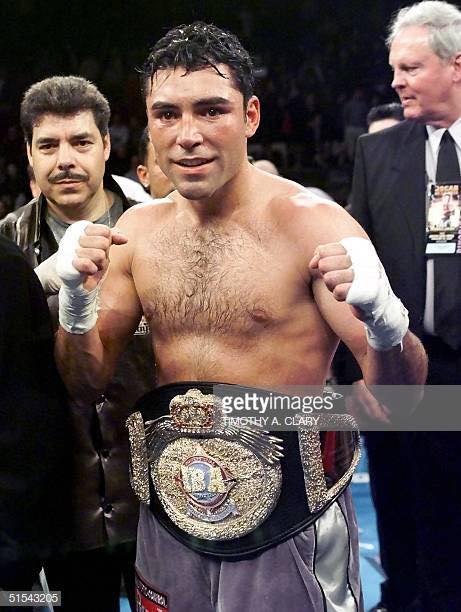 Oscar De La Hoya poses with the IBA Welterweight Championship Belt after knocking out Derrell Coley